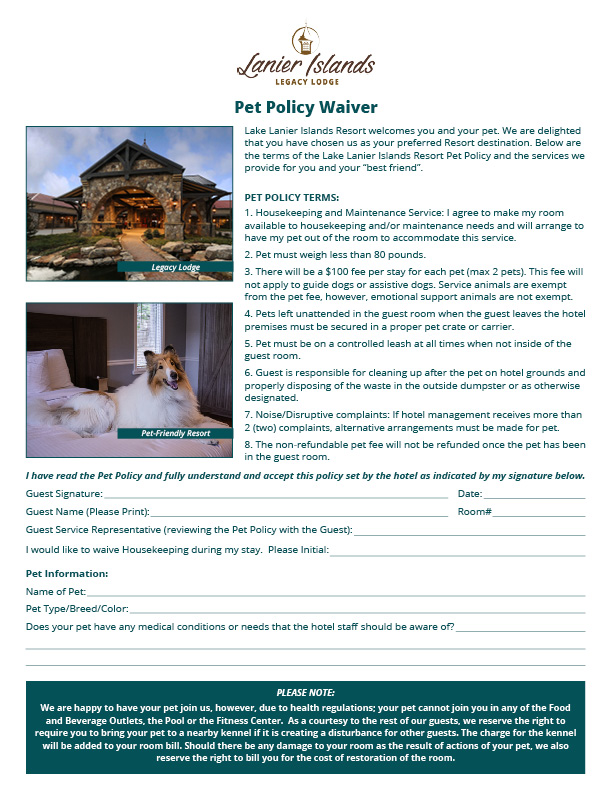 To book a dog-friendly room, please call 770-945-8787 to speak with a reservations agent or when booking on LanierIslands.com please be sure to select 'Bring Your Dog' under the 'Enhance Your Stay' section of the booking process. Click to review our Pet Policy.